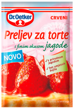 Baš za sezonu jagoda razvijen je Dr. Oetker Preljev za torte s okusom jagoda. S ovim preljevom jagode će na kolaču biti prezentirane u svom najvećem sjaju! Jer ovaj ukusni preljev svojom aromom potiče osvježavajući voćni okus jagode u kolaču i tako garantira vrhunski okus. Jednostavan je za uporabu, uvijek uspjeva i vrlo je čvrst za rezanje.