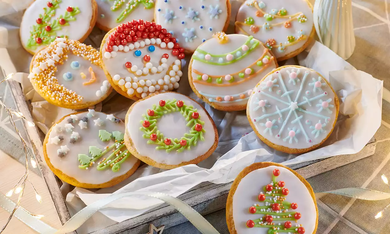 Prosijte šećer u prahu, dodajte mlijeko ili vodu i izradite gusti preljev. Kolačiće s donje strane premažite preljevom i pustite preljev da se stvrdne. Promijesite šareno pismo u tubi i izradite božićne motive. Po želji ukrasite božićnim ukrasima za posipanje.
