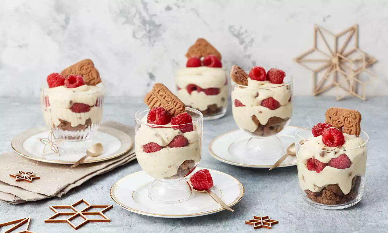 Ukrasite desert preostalim malinama i Spekulatius keksima i stavite u hladnjak do posluživanja.