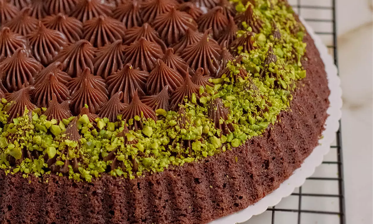 Kadaif usitniti što više i prepržiti na otopljenom maslacu (potrebno je oko 60 g maslaca) uz stalno miješanje dok ne dobije finu zlatnu boju. Prohladiti pa dodati pastu od pistacija (zagrijati teglicu u vreloj vodi ako je potrebno) i šećer u prahu i sve izmiješati silikonskom špatulom. Po želji dodati i 2 kašike tahini paste. Na biskvit ravnomjerno nanijeti fil sa kadaifom i pistacijama i poravnati. Ohlađen čokoladni fil prebaciti u poslastičarsku vrećicu sa zvjezdastim nastavkom i nanijeti preko fila od kadaifa i pistacija. Prije serviranja ukrasiti sjeckanim pistacijama. Kolač možete čuvati u frižideru ali prije posluživanja ostaviti oko 20 min na sobnoj temperaturi.