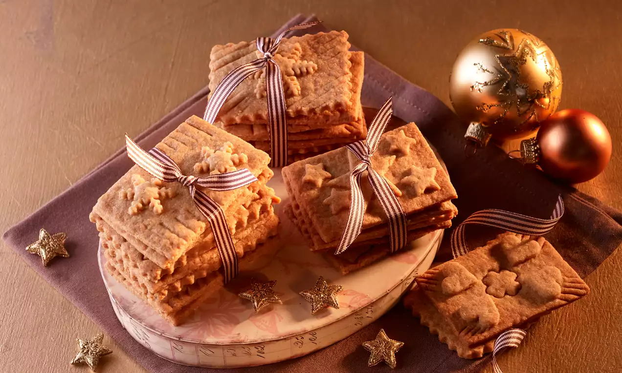 Tijesto podijelite na nekoliko porcija i svaku razvaljajte na lagano pobrašnjenoj radnoj površini na debljinu od oko 3 mm. Pomoću noža ili okruglog rezača za tijesto izrežite male pravokutnike (oko 7 x 5 cm). Po želji vilicom ili tupim rubom noža utisnite rubove. Kalupom za kekse sa širom stranom prema dolje oprezno utisnite motive ili izrežite male motive i stavite ih na kekse. Stavite kekse na lim za pečenje i pecite.