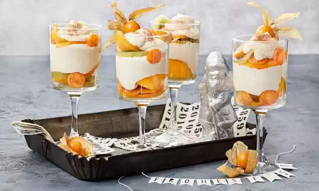 Krema od naranče, kremasti puding od vanilije, obogaćen sirom mascarpone i cimetom, složeno u slojevima s osvježavajućom voćnom salatom.