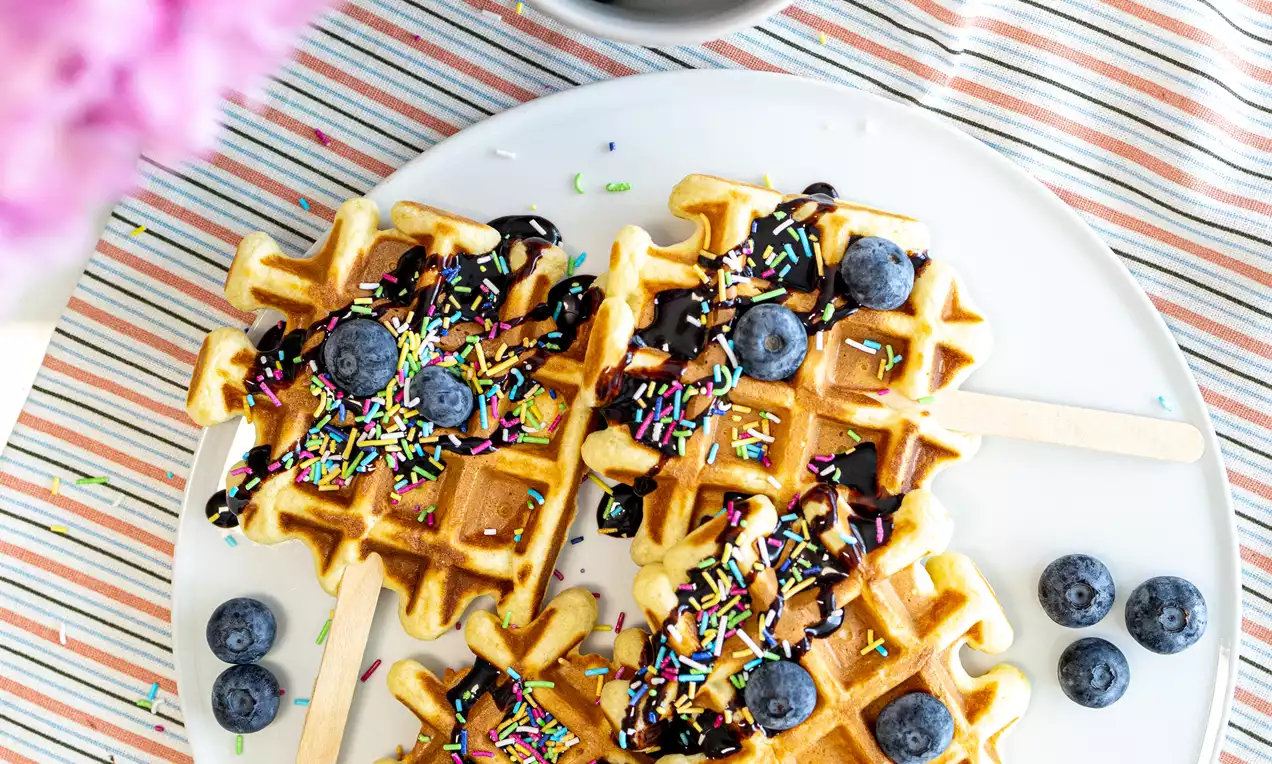 Kalup za waffle premažite maslacem, dodajte žlicu smjese na svaki waffle, a onda uronite štapić do pola, tako da viri van aparata za waffle.